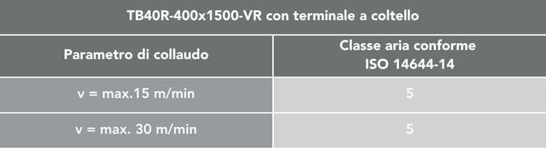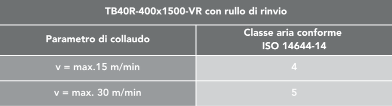 Il nastro trasportatore TB40R-400×1500 – VR è stato testato in conformità alla norma ISO 14644-14 ed è idoneo in base ai parametri di prova specificati